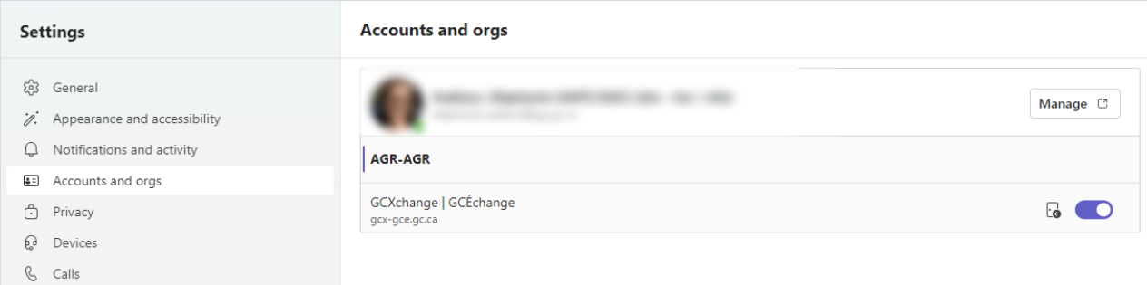 - Select the “Accounts and orgs” option from the pane on the left side of the screen. Then, use the toggle button that is in line with “GCXchange” to enable the account.